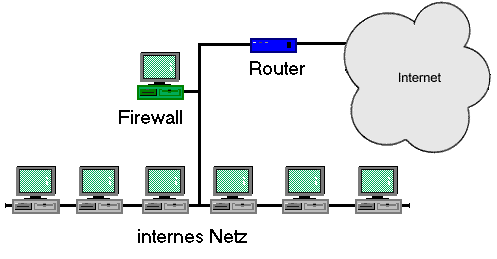 | Der Anschluss der Firewall kann auf zwei Arten erfolgen. Die erste Möglichkeit ist das Einbinden ins lokale Netz. Der Router dieses Netzes wird so konfiguriert, dass alle Datenpakete nur an den Firewall weitergegeben werden, der auch als einziges System 'nach außen sichtbar' ist: | ![]() |