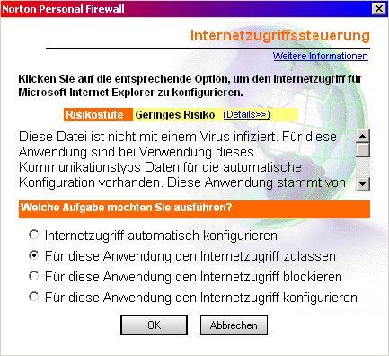 ![]() Hier die Frage nach Internetzugriff bei der Norton Personal Firewall, auch der Internet Explorer. |